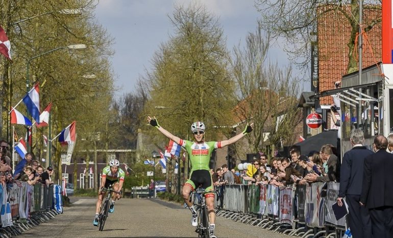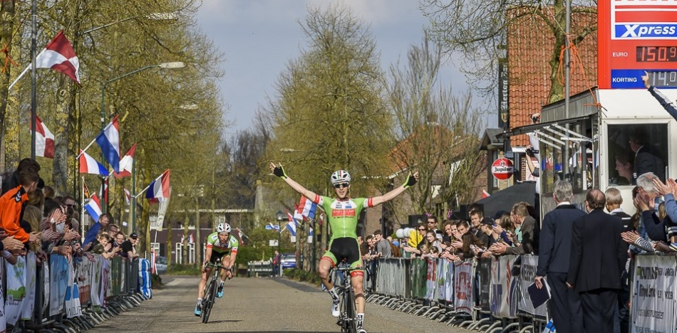 De renners van het Baby-Dump Cyclingteam hebben de Ronde van Oploo voor elite/beloften naar hun hand gezet. De groene formatie bezette na de koers alle drie de plekken op het ereschavot. Robbert de Greef (Geldrop) greep de zege, Koos-Jeroen Kers werd tweede en Arvid de Kleijn derde. (Foto: Willy Lathouwers)