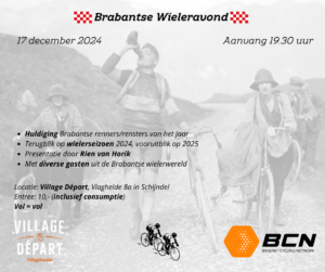 Tijdens de Brabantse wieleravond op 17 december in Village Départ vindt de huldiging plaats van de Brabantse renners en rensters van het jaar bij de nieuwelingen, junioren en beloften.