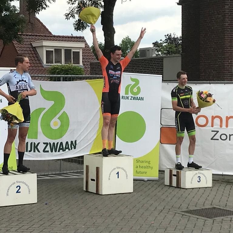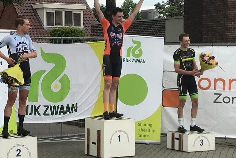 De renner uit Tilburg toonde zich na 80 kilometer de snelste in de sprint van een kopgroep met vijf renners. Martin Pluto en Kevin Reuvers mochten als tweede en derde mee op het podium.